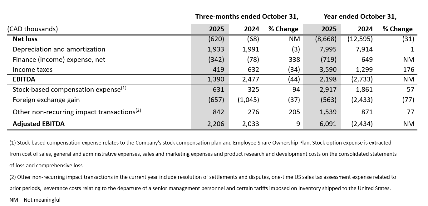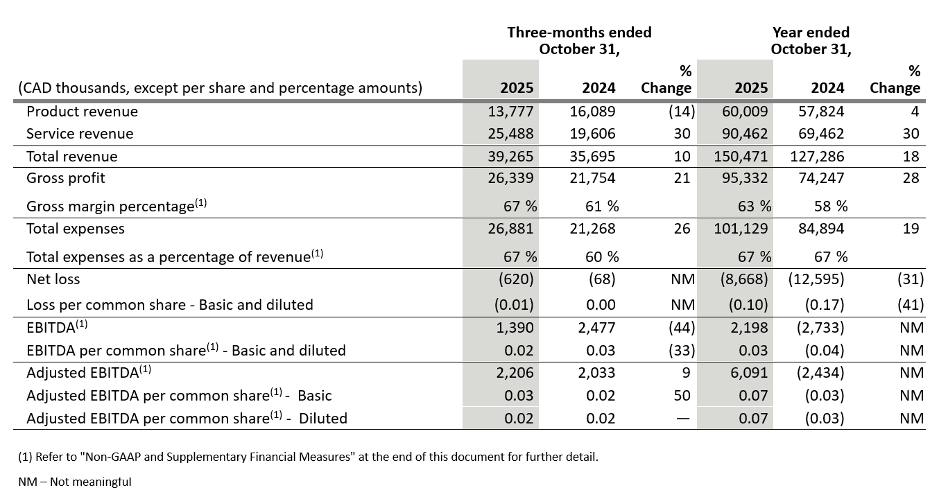 Per l'anno fiscale conclusosi il 31 ottobre 2025, il fatturato totale è aumentato del 18% su base annua, raggiungendo i 150,5 milioni di dollari. Il fatturato dei servizi è aumentato del 30% raggiungendo i 90,5 milioni di dollari, mentre quello dei prodotti è aumentato del 4% raggiungendo i 60,0 milioni di dollari. In Nord America, la Società ha registrato una crescita del 16% dei ricavi negli Stati Uniti rispetto all'anno precedente, mentre i ricavi in Canada sono aumentati del 22%. I ricavi in Europa sono aumentati del 19% rispetto all'anno precedente, mentre quelli nel resto del mondo sono cresciuti del 21%, sostenuti dall'espansione in Medio Oriente, compreso il nostro accordo di acquisto pluriennale recentemente annunciato con uno dei principali produttori mondiali di energia, la Abu Dhabi National Oil Company (ADNOC).