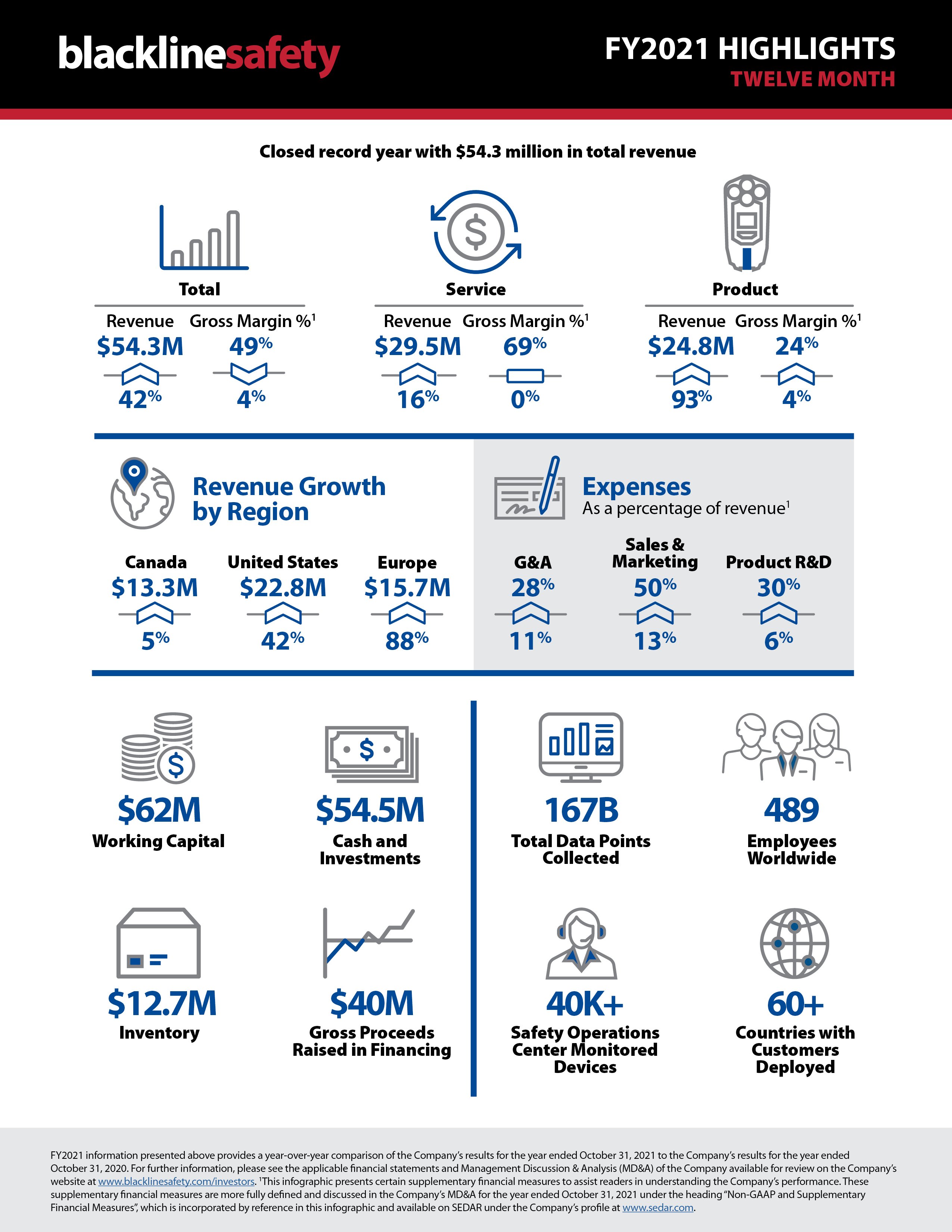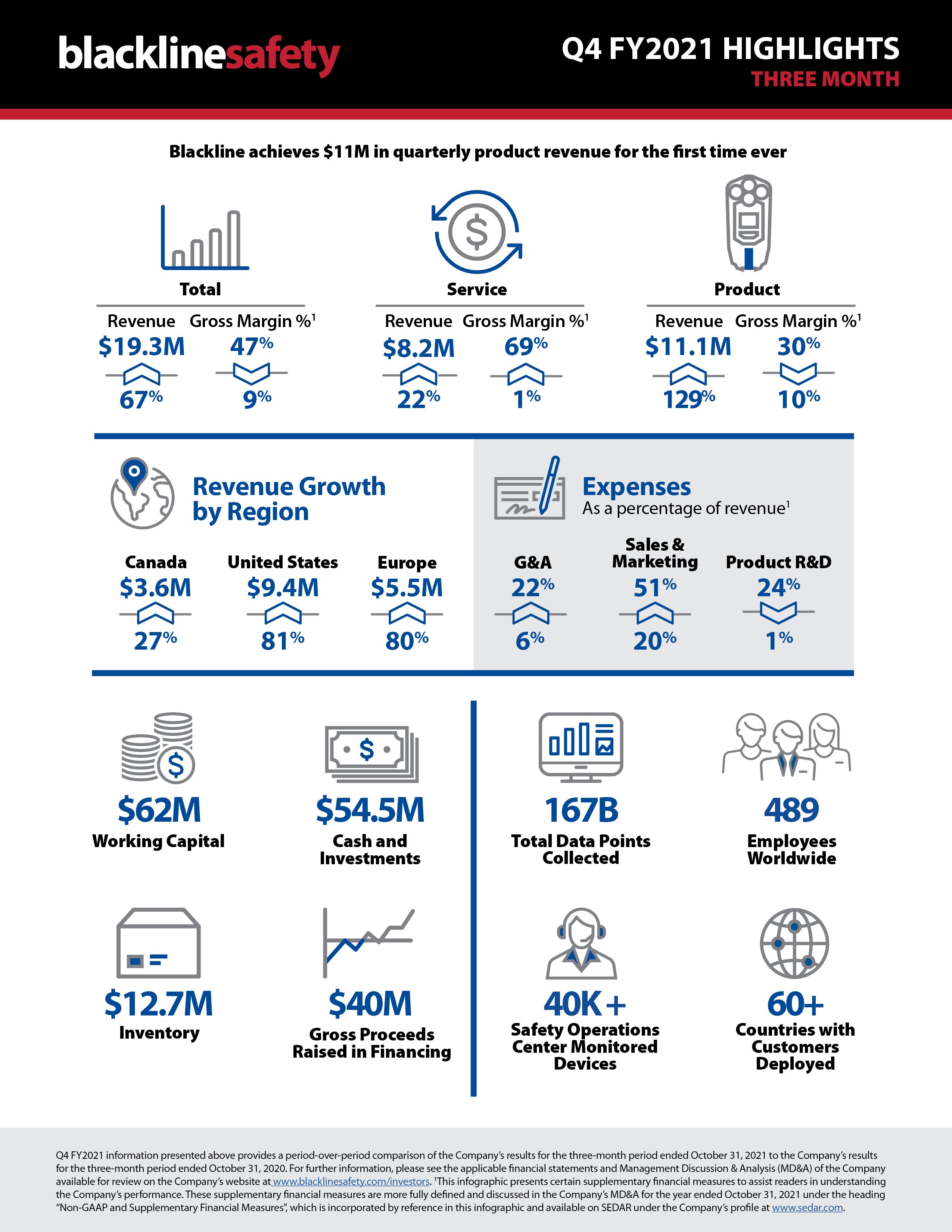 Calgary, Canada — 20 gennaio 2022 — Blackline Safety Corp. (TSX: BLN) ("Blackline Safety", "Blackline", la "Società", "noi", "ci" o "nostro"), leader mondiale nella tecnologia di sicurezza connessa con un modello di business Hardware-enabled software-as-a-service (HeSaaS), ha pubblicato oggi i risultati record dell'anno e del quarto trimestre fiscale.